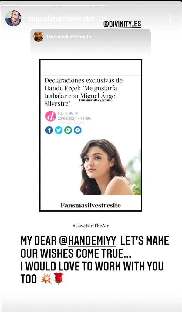 Hande Erçel, verdiği bir röportajında 'Sense8' dizisiyle tanınan İspanyol oyuncu Miguel Angel Silvestre ile çalışmak istediğini söylemişti. Yıldız oyuncudan Erçel'e yanıt gecikmedi.