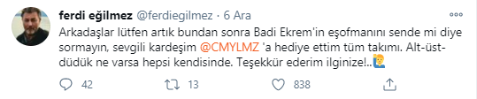 Sürekli kendisinden istenen eşofman takımıyla ilgili konuşan Ferdi Eğilmez, paylaşımında şu ifadeleri kullandı: "Arkadaşlar lütfen artık bundan sonra 'Badi Ekrem'in eşofmanı sende mi?' diye sormayın. Sevgili kardeşim Cem Yılmaz'a hediye ettim tüm takımı. Alt, üst, düdük ne varsa hepsi kendisinde. Teşekkür ederim ilginize..."