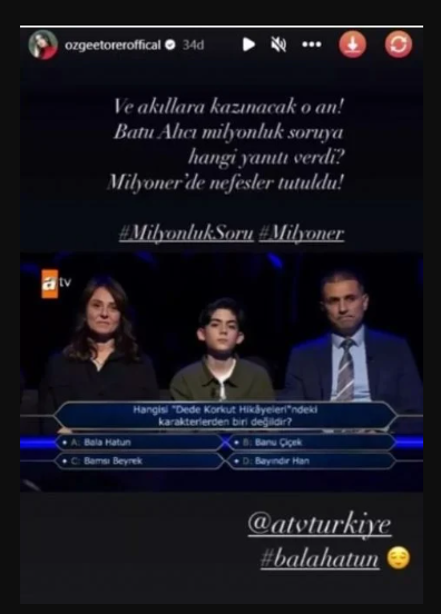 Geceye damga vuran soruya Kuruluş Osman dizisinde Bala Hatun karakterini canlandıran Özge Törer de kayıtsız kalamadı. Özge Törer, söz konusu soruyu Instagram hesabında yayınladı.