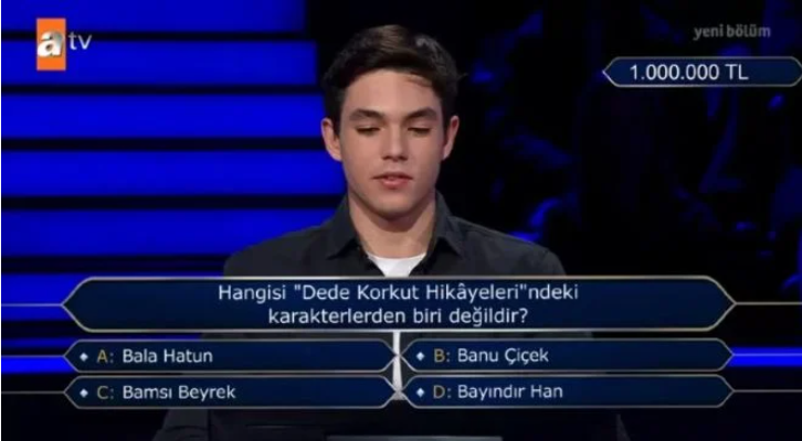Kim Milyoner Olmak İster yarışmasının dün gece yayınlanan bölümünde nefesler tutuldu. 1 milyon TL'lik soruyu açtırma başarısı gösteren Batu Alıcı, milyonları ekran başına kilitledi. Batu Alıcı, yanıtı Bala Hatun olan "Hangisi 'Dede Korkut Hikayeleri'ndeki karakterlerden biri değildir?" sorusu karşısında doğru cevaptan emin olamayınca yarışmadan çekildi.