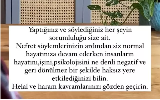 Yaptığınız ve söylediğiniz her şeyin sorumluluğu size ait. Nefret söylemlerinizin ardından siz normal hayatınıza devam ederken insanların hayatını, işini, psikolojisini ne denli negatif ve geri dönülmez bir şekilde haksız yere etkilediğinizi bilin. Helal ve haram kavramlarınızı gözden geçirin. En önemli göreV biz anne babalara düşüyor. Ben bir otorite değilim, iç güdülerimle evlatlarımı büyütmeye ve vicdanlı iyi kalpli bireyler olmalarında yol gösteriyorum sadece. Çocuklarınızın internette geçirdiği vakti ve içerikleri kontrol edin.