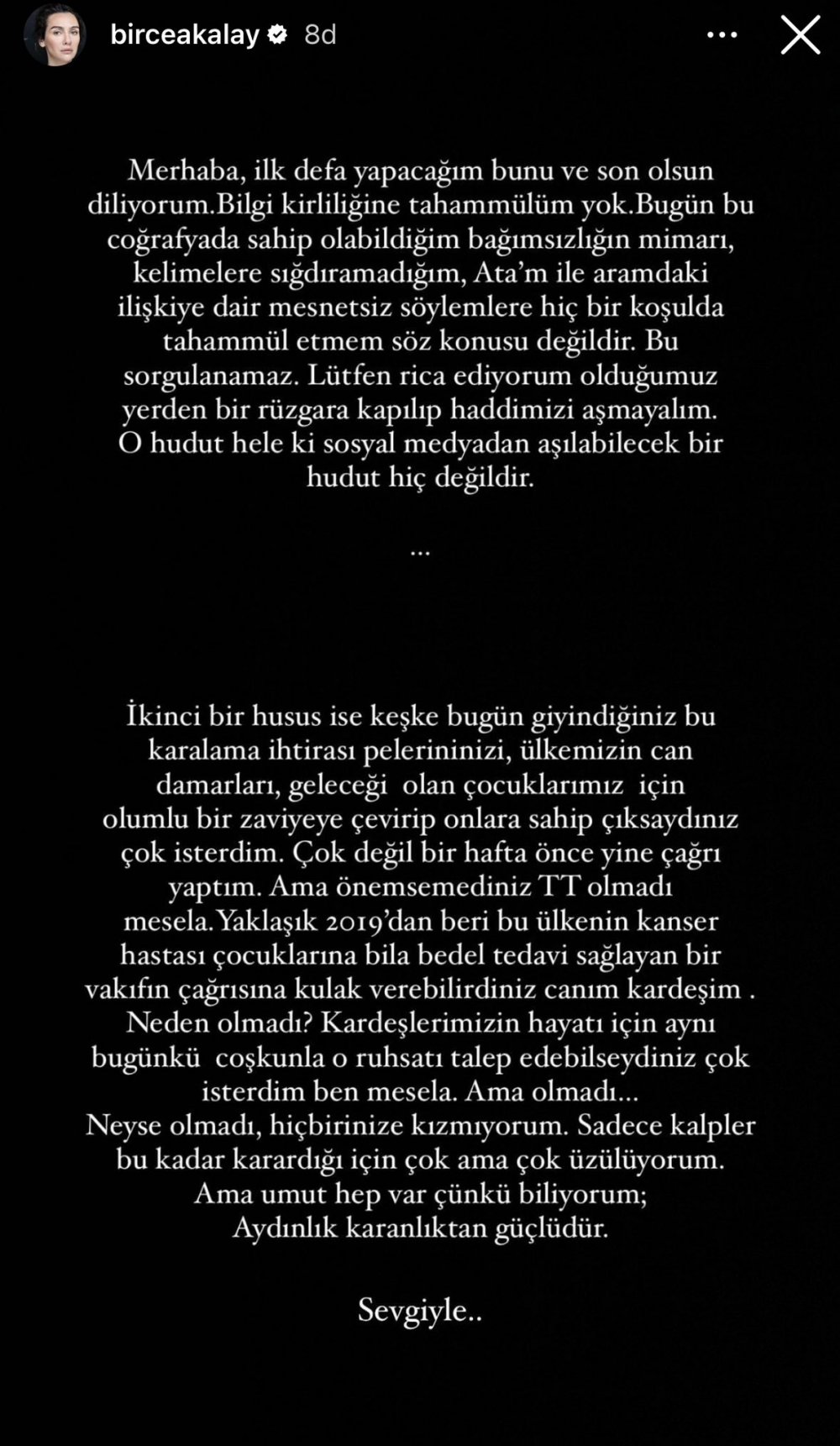 Gelen sorular üzerine Birce Akalay "Ben bu konuyla alakalı fikrimi beyan etmek isteseydim sosyal medya hesaplarımdan yapabiliyorum. Sorunuzu nazikçe reddetmek istiyorum. Mevzu bahis Atatürk olduğu zaman ben atakızıyım zaten. Çok fazla altını çizmeye gerek yok diye düşünüyorum" yanıtını verince ise tepki çekti.