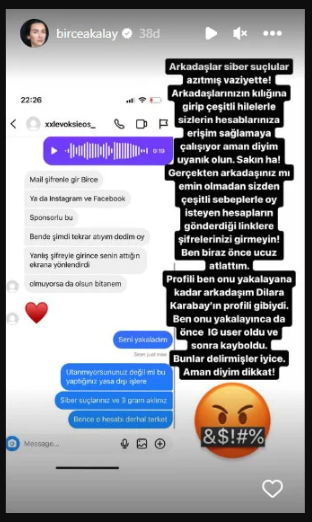 Akalay yaşadıklarını şu satırlarla paylaştı: "Arkadaşlar siber suçlular azıtmış vaziyette! Arkadaşlarınızın kılığına girip çeşitli hilelerle sizlerin hesaplarınıza erişim sağlamaya çalışıyor aman diyeyim uyanık olun!