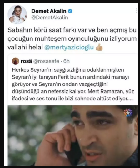 Akalın; ''Sabahın körü saat farkı var ve ben açmış bu çocuğun muhteşem oyunculuğunu izliyorum vallahi helal'' diyip Mert Yazıcıoğlu'nu etiketledi.