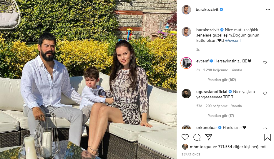 Instagram'da 17,8 milyon takipçisi bulunan Özçivit, oğlu Karan ve eşiyle olan aile pozunu paylaşarak "Nice mutlu, sağlıklı senelere güzel eşim. Doğum günün kutlu olsun" notunu yazdı.
