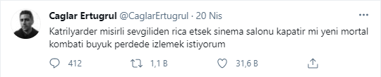 Ünlü oyuncu, "Katrilyarder Mısırlı sevgiliden rica etsek, sinema salonu kapatır mı? Yeni 'Mortal Kombat'ı büyük perdede izlemek istiyorum." sözleriyle, hayranlarını gülümsetti.