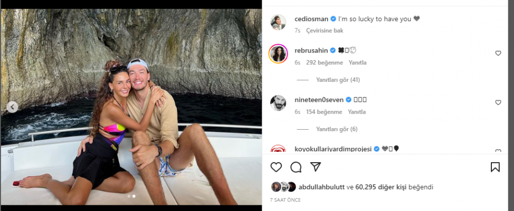 Aşka gelen Osman, Şahin'e; "Sana sahip olduğum için çok şanslıyım" diye seslendi. Bu sözlere kayıtsız kalmayan güzel oyuncu da eşinin paylaşımına yonca ve kalp emojisiyle yorum yaptı.