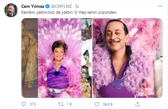 Konuyla ilgili sosyal medya hesabından paylaşım yapan Cem Yılmaz, Zeki Müren’in fotoğrafıyla kendi fotoğrafını birleştirerek, “Kendini yaktın, bizi de yaktın. Hep senin yüzünden” yazdı.