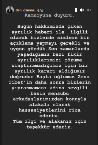 Ünlü şef Danilo Zanna'nın, 9 yıllık eşi Tuğçe Demirbilek’ten boşanacağı iddia edilmişti. Zanna, sosyal medyadan yaptığı açıklama ile çıkan haberleri doğruladı.