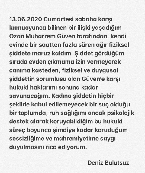Olayın tarafı Deniz Bulutsuz Instagram hesabından yaptığı açıklama ile çıkan haberleri doğruladı ve şöyle yazdı: 'Kendi evinde bir saatten fazla süren ağır fiziksel şiddete maruz kaldım. Şiddet gördüğüm sırada evden çıkmama izin vermeyerek canıma kasteden, fiziksel ve duygusal şiddetin sorumlusu olan Güven'e karşı hukuki haklarımı sonuna kadar savunacağım' dedi.