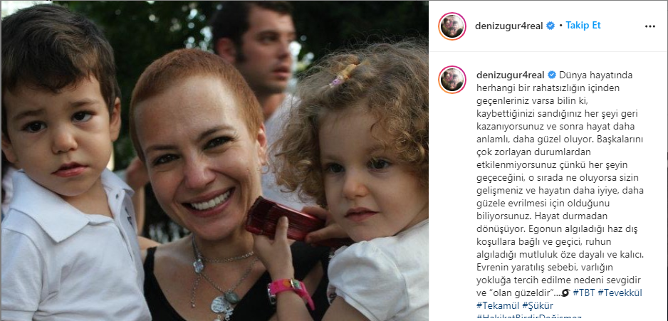 Tedavisinin sona erdiği dönemde iki çocuğuyla çekilen bir fotoğrafını paylaşan Uğur, "Dünya hayatında herhangi bir rahatsızlığın içinden geçenleriniz varsa bilin ki, kaybettiğinizi sandığınız her şeyi geri kazanıyorsunuz ve sonra hayat daha anlamlı, daha güzel oluyor.