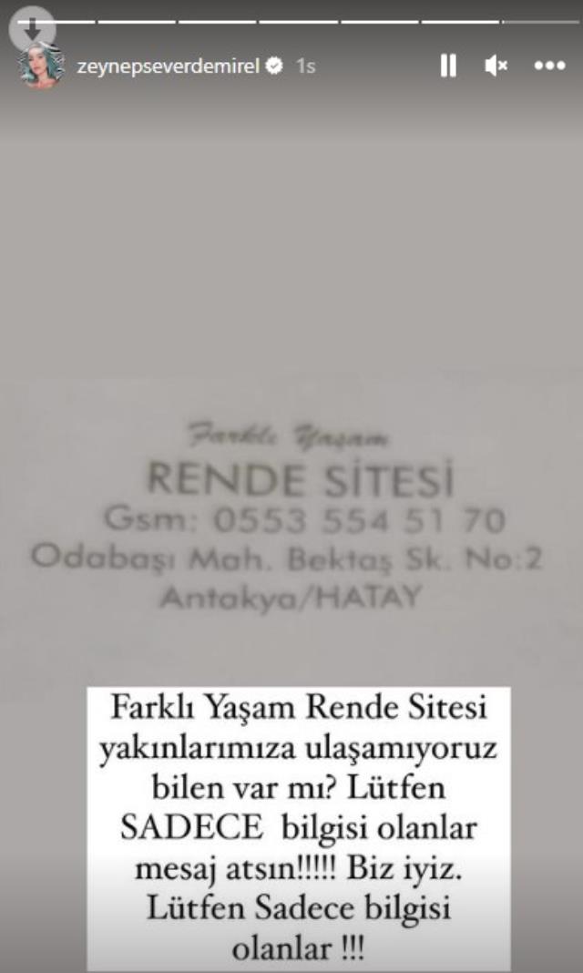 Instagram hesabından peş peşe paylaşımlar yaparak yakınlarına ulaşamadıklarını söyleyen Demire, "Hatay Rönesans rezidans ile ilgisi bilgisi olan var mı?" dedi. Kendilerinin durumunun iyi olduğunu ancak yakınlarına ulaşamadıklarını söyleyen Demirel, bir paylaşım daha yaparak "Farklı Yaşam Rende Sitesi yakınlarımıza ulaşamıyoruz. Bilen var mı? Lütfen sadece bilgisi olanlar mesaj atsın! Biz iyiyiz. Lütfen sadece bilgisi olanlar!" ifadelerini kullandı.