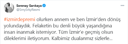 Sarıkaya Twitter hesabından yaptığı paylaşımda ” #izmirdepremi olurken annem ve ben İzmir’den dönüş yolundaydık. Felaketin bu denli büyük yaşandığına insan inanmak istemiyor. Tüm İzmir’e geçmiş olsun dileklerimi iletiyorum. Kalbimiz dualarımız sizlerle...” dedi.
