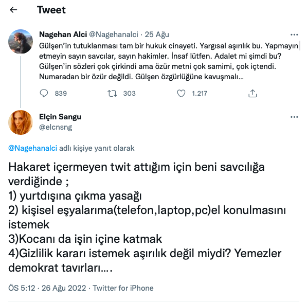 Oyuncu Elçin Sangu; HaberTürk yazarı Nagehan Alçı'nın, şarkıcı Gülşen'in tutuklanmasına tepki gösterdiği paylaşımına yanıt verdi. Sangu, "Hakaret içermeyen tweet attığım için beni savcılığa verdiğinde; 'yurt dışına çıkma yasağı' istemek aşırılık değil miydi? Yemezler demokrat tavırları" ifadelerini kullandı.