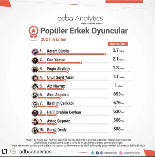 Adba sosyal medyada 2021’nin en çok konuşulanlarını belirledi. Çıkan sonuca göre, geride bıraktığımız yıl içerisinde dijital dünyada en çok konuşulan erkek oyuncu Kerem Bursin oldu. Kerem Bursin'i ikinci sırada Can Yaman izlerken, üçüncü ise Engin Akyürek oldu.