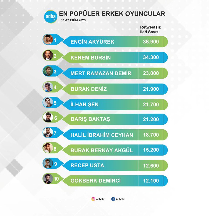 Adba 11-17 Ekim arasında sosyal medyada en çok konuşulan erkek oyuncuları belirledi. Çıkan sonuca göre, en çok konuşulan erkek oyuncu Engin Akyürek oldu.