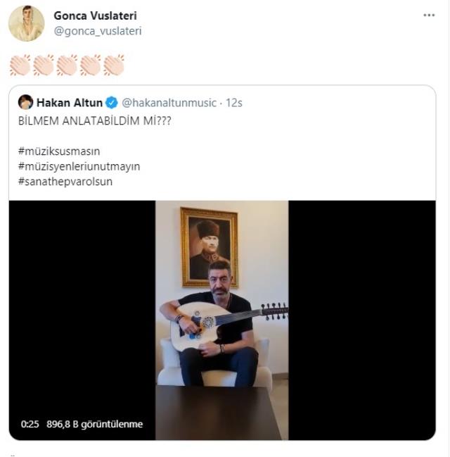 Hakan Altun'un videosunu gören eski sevgilisi Gonca Vuslateri de sesiz kalamadı. Twitter hesabından Altun'un videosunu paylaşan Vuslateri, alkış emojisi koydu.