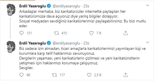 İddiaları yalanlayan Yaşaroğlu, şöyle dedi: "Arkadaşlar merhaba, biz karikatürcüler internette paylaşılan her karikatürümüze dava açıyoruz diye yanlış bilgiler dolaşıyor. Sosyal medyadan sevdiğiniz karikatürlerimizi paylaşabilirsiniz. Bu bizi mutlu eder.