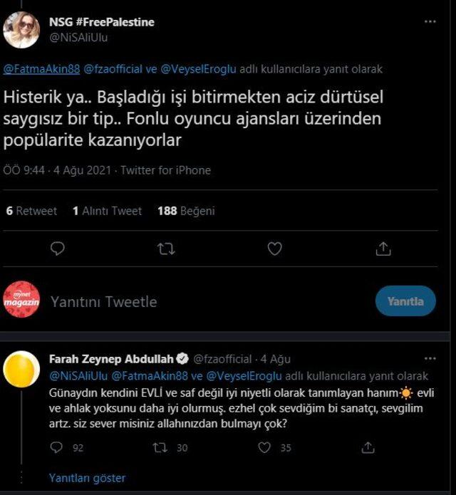Farah Zeynep Abdullah bir Twitter kullanıcısının "Bu madde bağımlısı Ezhel'in sevgilisi olmaktan utanmayan kız değil mi? Düşüp kalmadıkları çukur yok" yorumlarıyla çileden çıktı. Abdullah takipçinin kendisi için "Histerik ya. Başladığı işi bitirmekten aciz dürtüsel saygısız bir tip. Fonlu oyuncu ajansları üzerinden popülarite kazanıyorlar" yorumlarıyla sessizliğini bozdu.