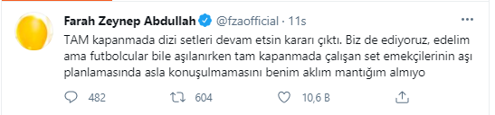 TRT'nin iddialı dizisi Masumlar Apartmanı'nda rol alan Farah Zeynep Abdullah, tam kapanma sürecinde de çalışan set çalışanlarının aşılanmamasına tepki gösterdi.