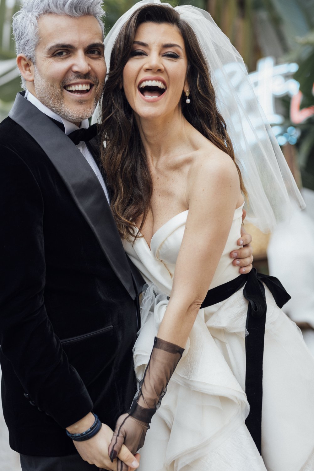 Başrolünde yer aldığı dizinin çekimlerinden dolayı gelinliğini set arasında seçen oyuncu, starplez gelinlik tercih ederken, siyah tül eldiven, siyah kuşak ve kısa duvak kullandı.