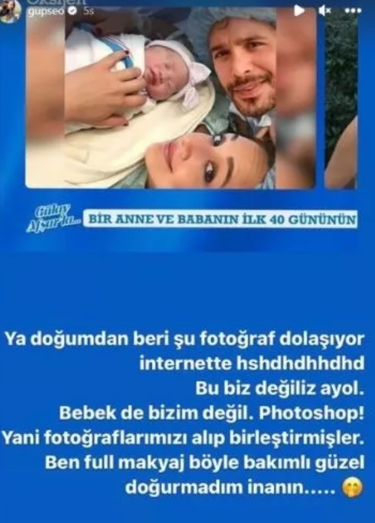 Ünlü oyuncu Gupse Özay, sosyal medyada kendisine ait olduğu sanılan bir fotoğrafla ilgili: Ya doğumdan beri şu fotoğraf dolaşıyor internette :) Bu biz değiliz ayol. Bebek de bizim değil. Photoshop! Yani fotoğraflarımızı alıp birleştirmişler. Ben full makyaj böyle bakımlı güzel doğurmadım inanın…” ifadeleriyle yanlışı düzeltti.