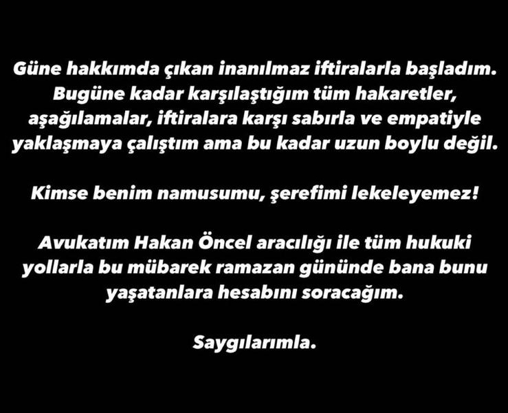 Konu hakkında açıklama yapan Hadise "Güne hakkımda çıkan inanılmaz iftiralarla başladım. Bugüne kadar karşılaştığım tüm hakaretler, aşağılamalar, iftiralara karşı sabırla ve empatiyle yaklaşmaya çalıştım ama bu kadar uzun boylu değil. Kimse benim namusumu, şerefimi lekeleyemez. Avukatım Hakan Öncel aracılığı ile tüm hukuki yollarla bu mübarek ramazan gününde bana bunu yaşatanlara hesabını soracağım" ifadelerini kullandı.