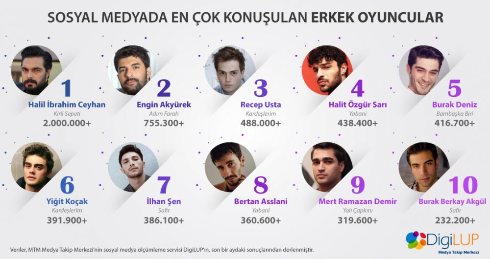 MTM Medya Takip Merkezi’nin profesyonel sosyal medya dinleme servisi DigiLUP verilerine göre, son 1 aydaki erkek oyuncular sıralamasının zirvesinde Halil İbrahim Ceyhan var.