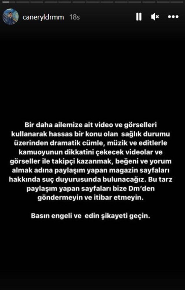 Gamze Erçel'in 2,5 yaşındaki küçük kızının babası Caner Yıldırım ise yapılan paylaşımlardan rahatsız oldu. Caner Yıldırım açıklamasında "Bir daha ailemize ait video ve görselleri kullanarak hassas bir konu olan sağlık durumu üzerinden dramatik cümle, müzik ve editlerle kamuoyunun dikkatini çekecek videolar ve görseller ile takipçi kazanmak adına paylaşım yapan magazin sayfaları hakkında suç duyurusunda bulunacağım" dedi.