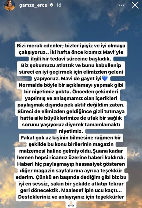 Daha 2,5 yaşında olan küçük Mavi'nin hastalığı ilk olarak ailesinin şüpheleri sonucu ortaya çıktı. Küçük Mavi'nin hastalığı, karnında oluşan şişlik sonucu ortaya çıktı. Anne ve babası bu gerçeği kızlarını, şüphe üzerine hastaneye götürerek öğrendi. Konuyla ilgili Gamze Erçel açıklama yaptı.