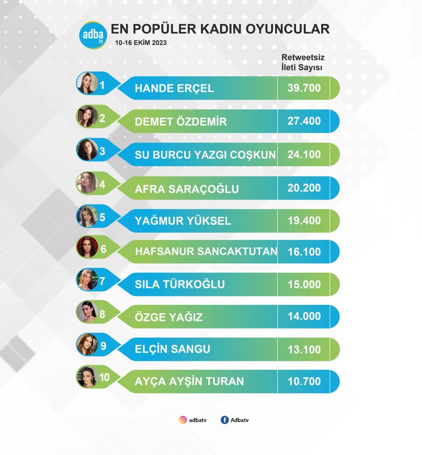 Adba 10-16 Ekim arasında sosyal medyada en çok konuşulan kadın oyuncuları belirledi. Çıkan sonuca göre, en çok konuşulan kadın oyuncu yine Hande Erçel oldu.