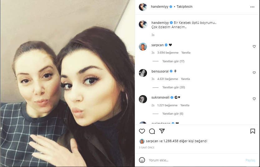 Erçel paylaşımına "Bir Kelebek öptü boynumu. Çok özledim Annecim.." notunu düştü.