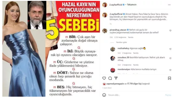 Hürriyet Gazetesi Genel Yayın Yönetmeni Ahmet Hakan'ın Netflix'te yayına giren Pera Palas’ta Gece Yarısı dizisinde başrol oynayan Hazal Kaya'nın oyunculuğu hakkındaki yazısı sosyal medyada gündem oldu.