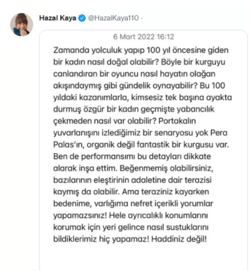 Hazal Kaya da konuyla ilgili suskunluğunu bozdu. Ünlü oyuncu, Twitter'dan yaptığı paylaşımda şu ifadelere yer verdi: "Zamanda yolculuk yapıp, 100 yıl öncesine giden bir kadın nasıl doğal olabilir? Böyle bir kurguyu canlandıran bir oyuncu nasıl hayatın olağan akışındaymış gibi gündelik oynayabilir? Bu 100 yıldaki kazanımlarla kimsesiz, tek başına ayakta durmuş bir kadın geçmişte yabancılık çekmeden nasıl var olabilir? Portakalın yuvarlanışını izlediğimiz bir senaryosu yok 'Pera Palas'ın... Organik değil, fantastik bir kurgusu var. Ben de performansımı bu detayları dikkate alarak inşa ettim. Beğenmemiş olabilirsiniz. Bazılarının eleştirinin adaletine dair terazisi kaymış da olabilir. Ama teraziniz kayarken bedenime, varlığıma nefret içerikli yorumlar yapamazsınız! Hele ayrıcalıklı konumlarını korumak için yeri gelince nasıl sustuklarını bildiklerimiz hiç yapamaz! Haddiniz değil!"