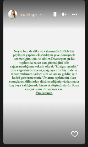 Kaya'dan konuyla ilgili yeni paylaşım geldi. Oyuncu "Öfke ve tahammülsüzlükle bir paylaşım yaptım ve eleştirdiğim şeye dönüşmemek için de sildim" dedi.