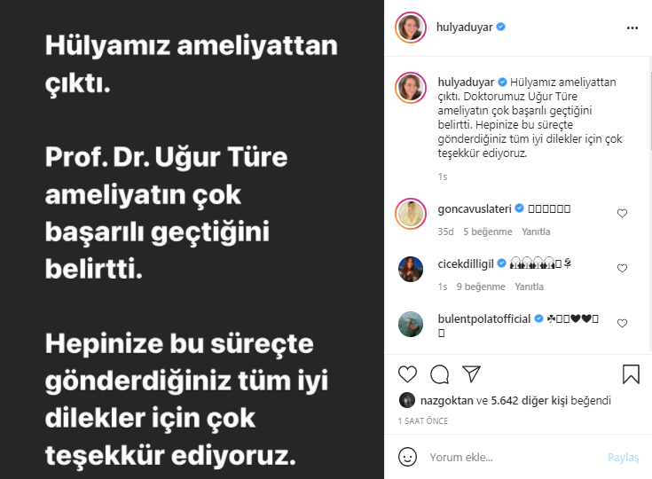 Hülya Duyar'ın operasyonu başarılı geçti. Duyar'ın sosyal medya hesabından yapılan açıklamada, "Hülya'mız ameliyattan çıktı. Prof. Dr. Uğur Türe, ameliyatın çok başarılı geçtiğini belirtti." ifadeleri kullanıldı
