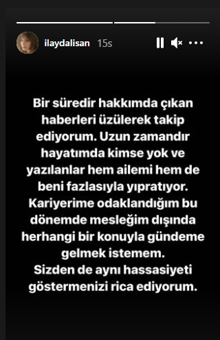Oyuncu sosyal medya hesabından yaptığı paylaşımda: "Uzun zamandır hayatımda kimse yok" dedi.
