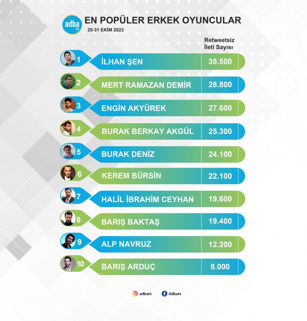 Adba 25-31 Ekim arasında sosyal medyada en çok konuşulan erkek oyuncuları belirledi. Çıkan sonuca göre, en çok konuşulan erkek oyuncu İlhan Şen oldu.
