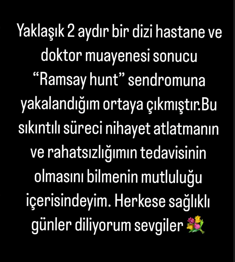 Bu sıkıntılı süreci nihayet atlatmanın ve rahatsızlığımın tedavisinin olmasını bilmenin mutluluğu içerisindeyim. Herkese sağlıklı günler diliyorum, sevgiler." dedi.