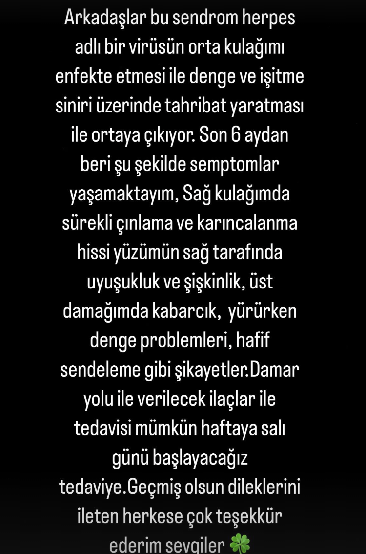 Ünlü isim hastalıkla ilgili de bilgi verdi ve " Arkadaşlar bu sendrom "herpes" adlı bir virüsün orta kulağımı enfekte etmesi ile denge ve işitme siniri üzerinde tahribat yaratması ile ortaya çıkıyor.