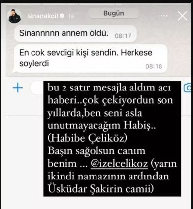 Sinan Akçıl ise kötü haberi sosyal medyadan paylaştı. İzel'in kendisine attığı mesajı yayınlayan Akçıl şu ifadeleri kullandı; 'Bu iki satır mesajla aldım acı haberi. Çok çekiyordun son yıllarda, ben seni asla unutmayacağım Habiş... (Habibe Çelikgöz)