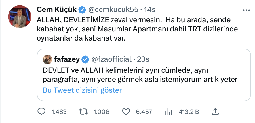 İktidara yakınlığıyla bilinen Türkiye gazetesinde yazarı Cem Küçük, oyuncu Farah Zeynep Abdullah'ın "Devlet ve Allah kelimelerini aynı cümlede görmek istemiyorum" paylaşımına Twitter'dan tepki gösterdi.