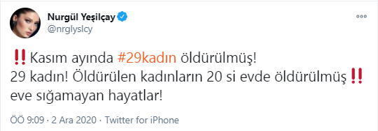 Geride bıraktığımız kasım ayında 29 kadının cinayete kurban gittiği bilgisini Twitter hesabında paylaşan Yeşilçay, “Kasım ayında 29 kadın öldürülmüş. 20’si evde öldürülmüş. Eve sığamayan hayatlar" iafedelerini kullandı.