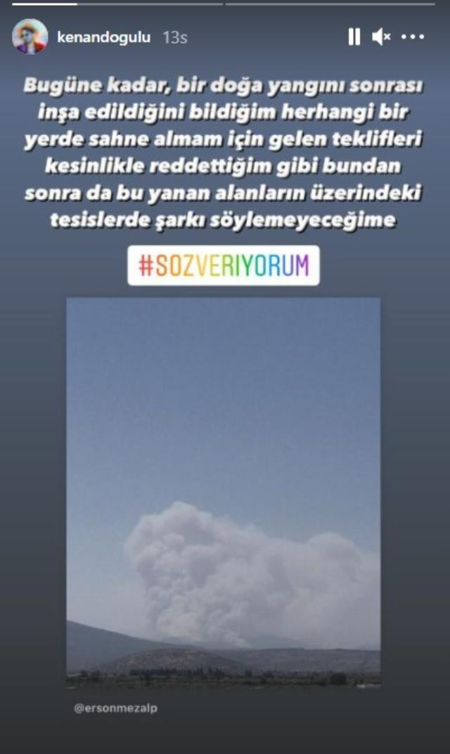 Diğer yandan dün Instagram hesabından bir mesaj yayınlayan Kenan Doğulu, #SözVeriyorum etiketiyle şu mesajı paylaştı: “Bugüne kadar, bir doğa yangını sonrası inşa edildiğini bildiğim herhangi bir yerde sahnen almam için gelen teklifleri kesinlikle reddettiğim gibi bundan sonra da bu yanan alanların üzerindeki tesislerde şarkı söylemeyeceğime söz veriyorum.”