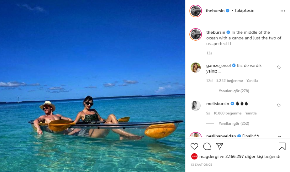 Aşkın tamamen açığa çıkmasının ardından Kerem Bürsin, sevgilisi Hande Erçel’le yaptığı Maldivler tatilinden bir kare paylaştı: “Okyanusun ortasında bir kano ve sadece ikimiz. Mükemmel...” notunu düştü.
