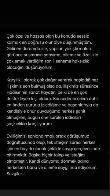 Evliliğimizi sonlandırmak ortak görüşümüz doğrultusunda olup, tek isteğim süreci herkes için en hayırlı olacak şekilde saygı çerçevesinde bitirmektir. Başka hiçbir talep ve isteğim olmamıştır. Kendi dünyama dönmek adına herkesten bana ve aileme saygı rica ediyorum. Sevgiler...