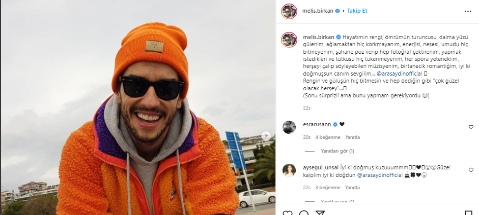 Oyuncu duygularını da şöyle dile getirdi: “Hayatımın rengi, ömrümün turuncusu, daima yüzü gülenim, enerjisi, neşesi, umudu hiç bitmeyenim, bir tanecik romantiğim, rengin ve gülüşün hiç bitmesin.”