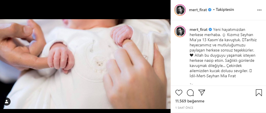 Ünlü oyuncu Mert Fırat 13 Kasım'da kucağına aldığı bebeği Seyhan Mia’yla yaptığı paylaşımla sevenlerine güzel dilekleri için teşekkür etti.