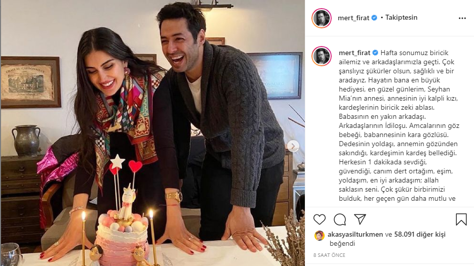 Fırat şu ifadeleri kullandı: "Hafta sonumuz biricik ailemiz ve arkadaşlarımızla geçti. Çok şanslıyız şükürler olsun, sağlıklı ve bir aradayız. Hayatın bana en büyük hediyesi, en güzel günlerim, Seyhan Mia’nın annesi, annesinin iyi kalpli kızı, kardeşlerinin biricik zeki ablası. Babasının en yakın arkadaşı. Arkadaşlarının İdiloşu. Amcalarının göz bebeği, babannesinin kara gözlüsü. Dedesinin yoldaşı, annemin gözünden sakındığı, kardeşimin kardeş bellediği. Herkesin 1 dakikada sevdiği, güvendiği, canım dert ortağım, eşim, yoldaşım, en iyi arkadaşım; allah saklasın seni. Çok şükür birbirimizi bulduk, her geçen gün daha mutlu ve sağlıklı günlerimizde kızımızı sen gibi büyütelim. İyi ki doğdun..."