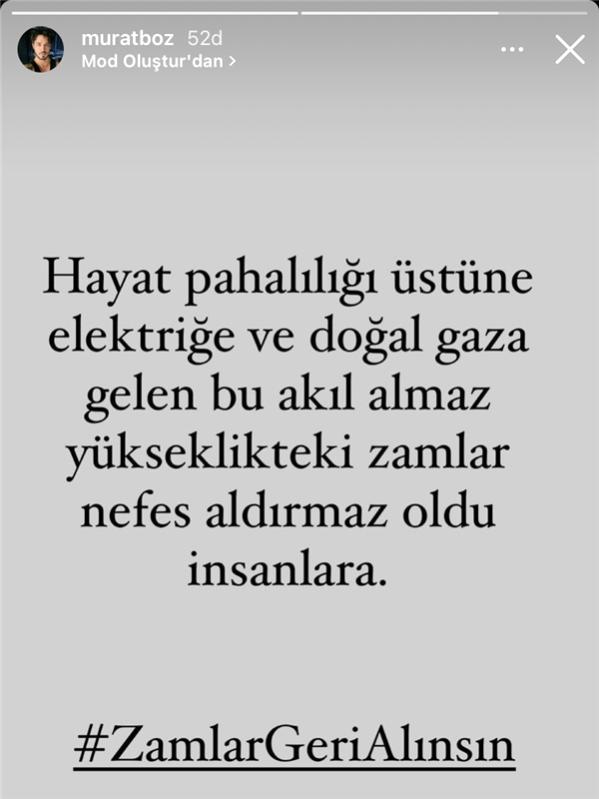 Cem Yılmaz, Şahan Gökbakar, Seray Sever, Yeşim Salkım, Serkan Kaya, Gürgen Öz, Gülse Birsel, Oğuzhan Uğur ve İdo Tatlıses'ten sonra son dönemde yapılan zamlara bir tepki de Murat Boz'dan geldi.